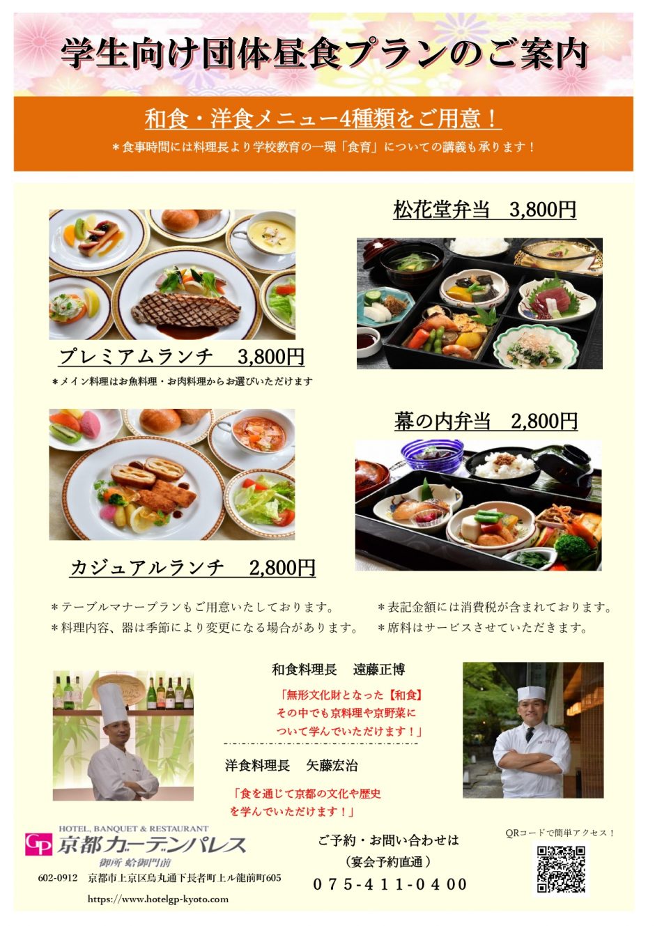 京都ガーデンパレスでは食事をしていただける事はもちろん、学校教育の一環「食育」について食事時間を利用し料理長自ら講義をおこなう新たなプランをご提案いたします。
