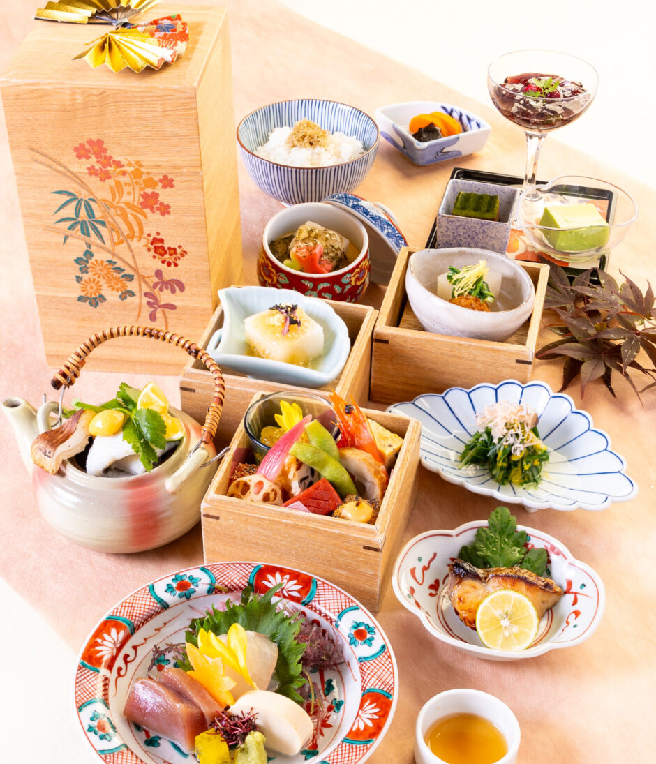 お昼の人気メニュー「花投扇」の向付、水菓子などをグレードアップさせてご夕食にもご準備しました。